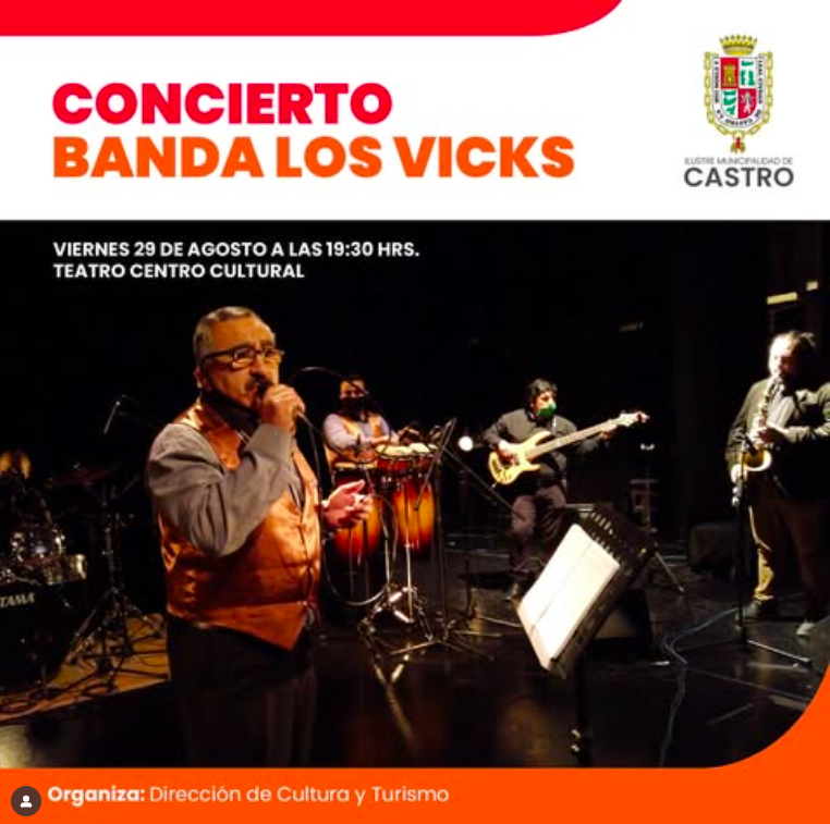 Este viernes 29 de agosto a las 19:30 horas, el Teatro del Centro Cultural de Castro se llenará de ritmo y energía con el gran Concierto de la Banda Los Vicks 🎤🎸🥁.