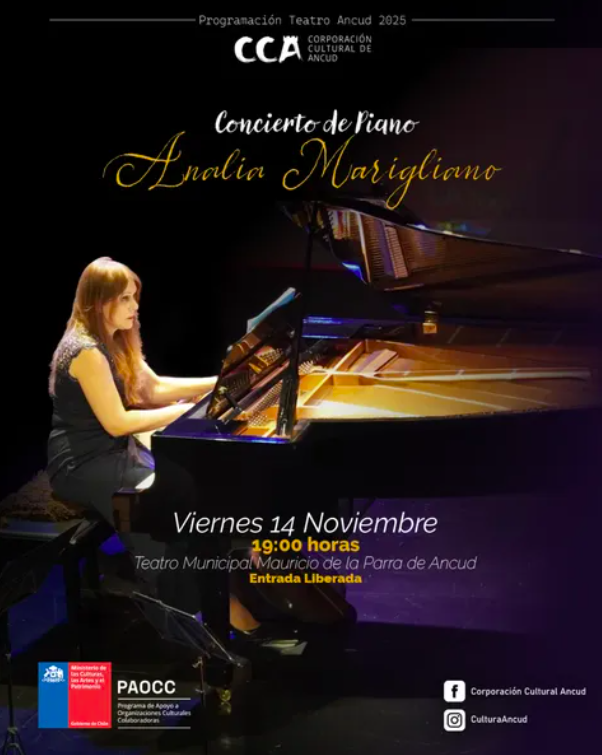 La Corporación Cultural de Ancud te invita a disfrutar de una inolvidable velada musical este viernes 14 de noviembre a las 19:00 horas en el Teatro Municipal Mauricio de la Parra, junto a la destacada pianista Analia Marigliano.