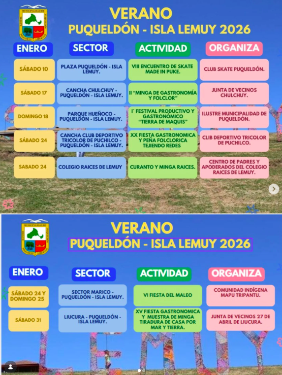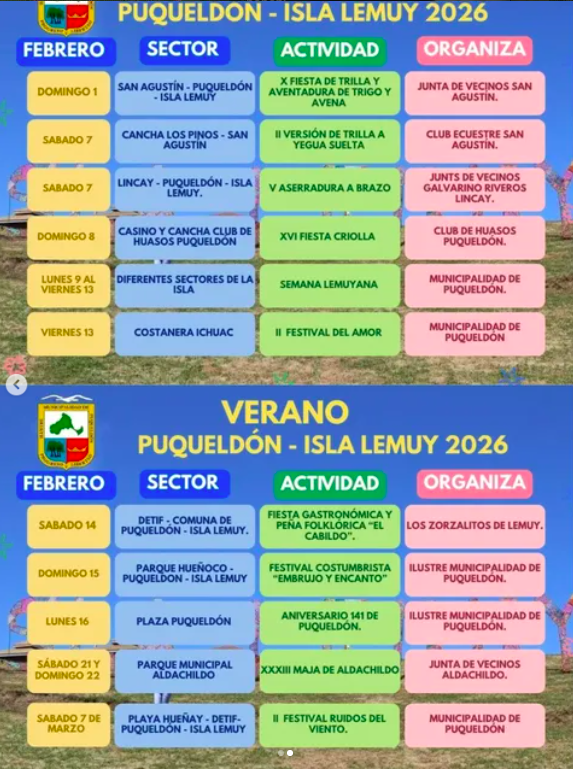 La Ilustre Municipalidad de Puqueldón, junto a juntas de vecinos, organizaciones sociales, clubes deportivos y comunidades locales, invita a toda la comunidad y visitantes a disfrutar de un verano lleno de tradiciones, cultura, gastronomía y alegría en la hermosa Isla Lemuy.